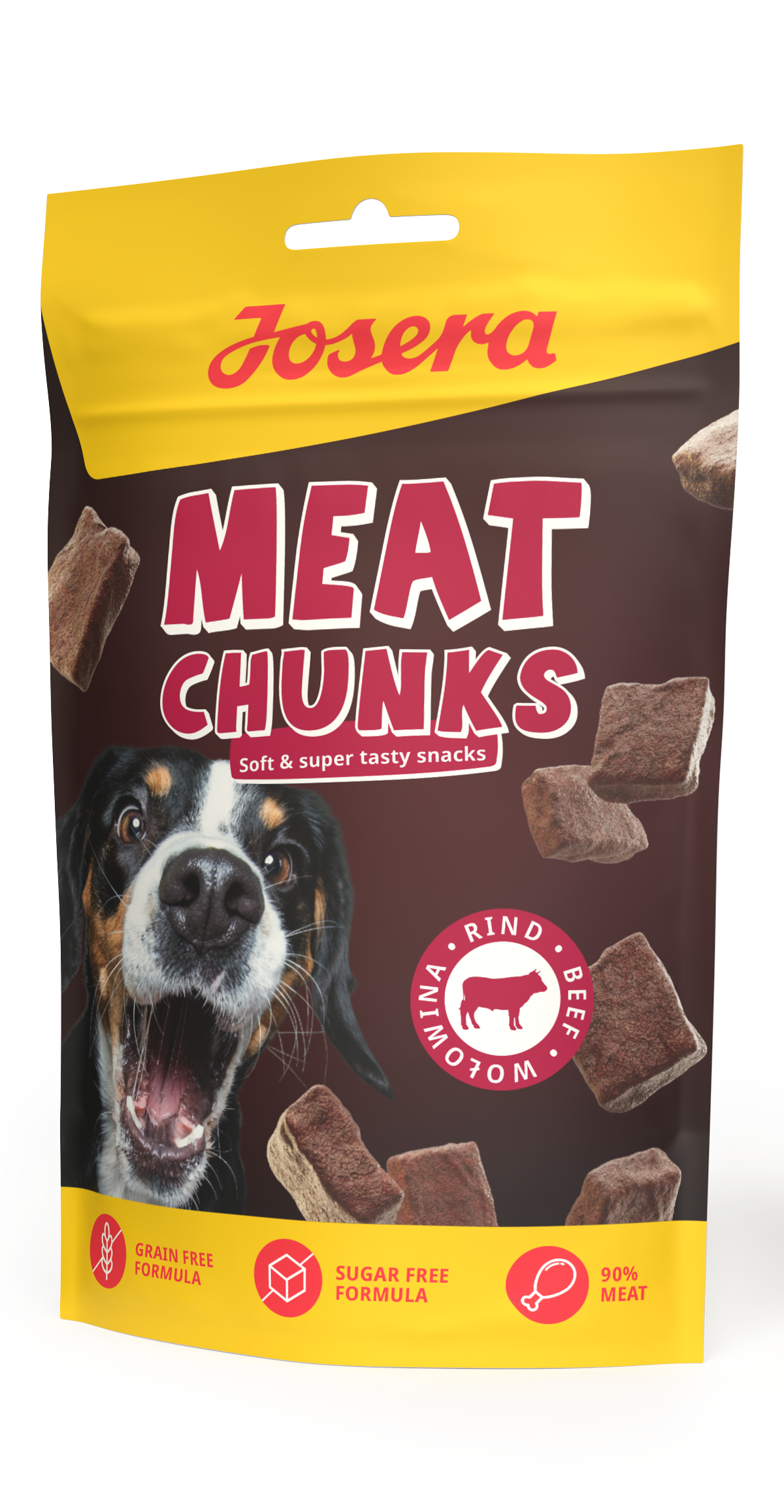 Hamm! Ééés nyamm! Az előre felporciózott Josera Meat Chunks kényelmes és szinte becsusszan a szőrös barát szájába. Ééés nyamm! A kíméletesen szárított marhahúsos falatok szempillantás alatt eltűnnek, mert 90%-os hústartalommal készülnek és nagyon jó ízűek. A gabona- és cukormentes receptúra E-vitamint és L-karnitint is tartalmaz az aktív négylábúak támogatásáért.