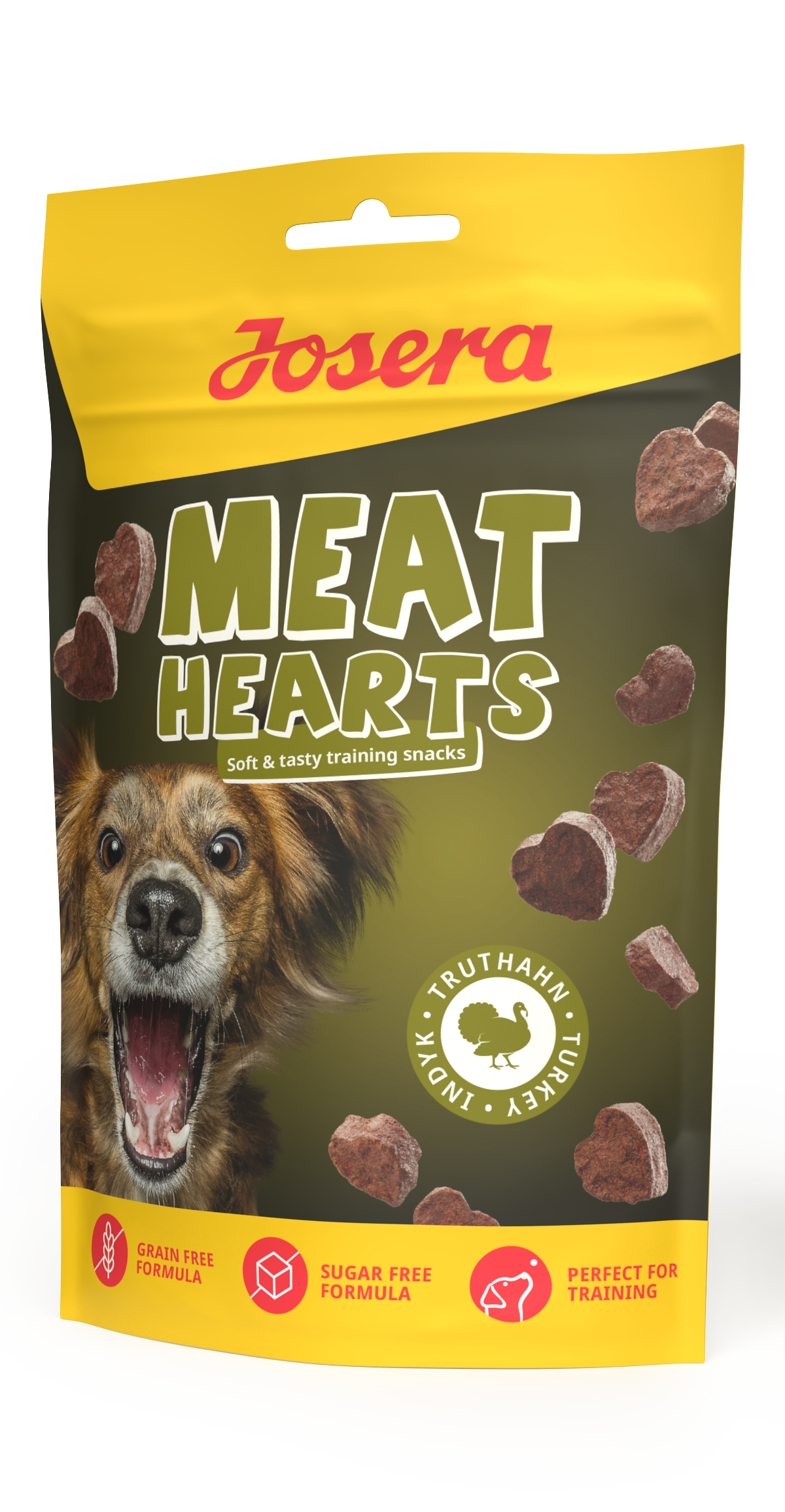 A Josera Meat Hearts Turkey szívből jövő gesztus - és tökéletes a négylábú barát napi jutalmazásához. Puha állagának és aranyos szív alakjának köszönhetően ellenállhatatlan, az átgondolt receptúrának köszönhetően pedig könnyen emészthető. Ez a gabonamentes és alacsony kalóriatartalmú jutalomfalat sok húst tartalmaz, miközben E-vitaminnal és L-karnitinnel támogatja az aktív kutyákat.