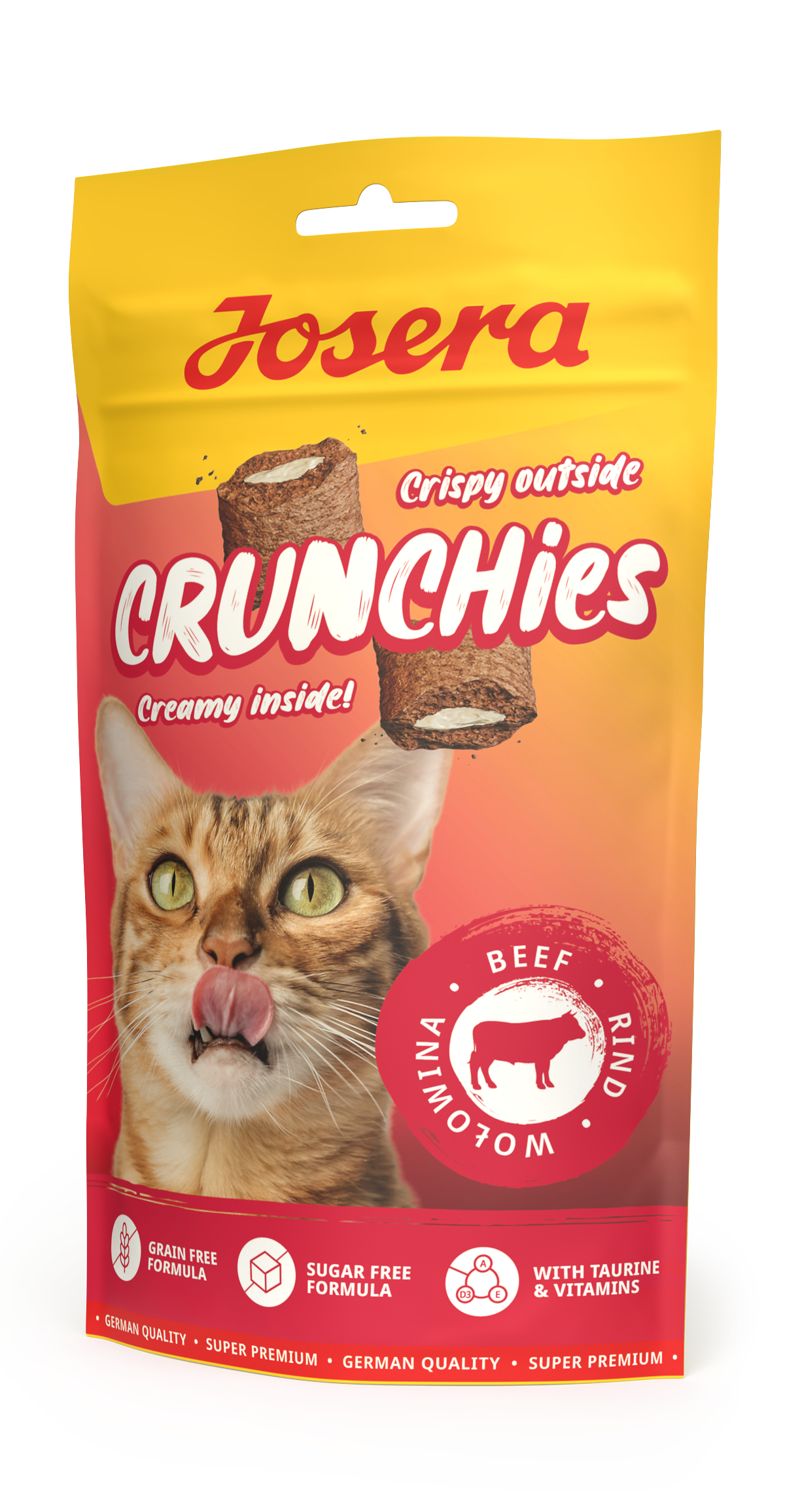 Hihetetlen, hogy a Josera Crunchies Beef egyszerre milyen ropogós és krémes, ráadásul rendkívül finom is! Ezek a ropogós marhahúsos párnák gyorsan a macska új kedvenc csemegéjévé válnak - az alacsony kalóriatartalmú, gabonamentes receptúrának köszönhetően pedig mindennap kaphat belőle. Ez a macskáknak készült ínyenc falat kívül ropogós héjjal csábít, belül pedig krémes töltelékkel kényeztet.